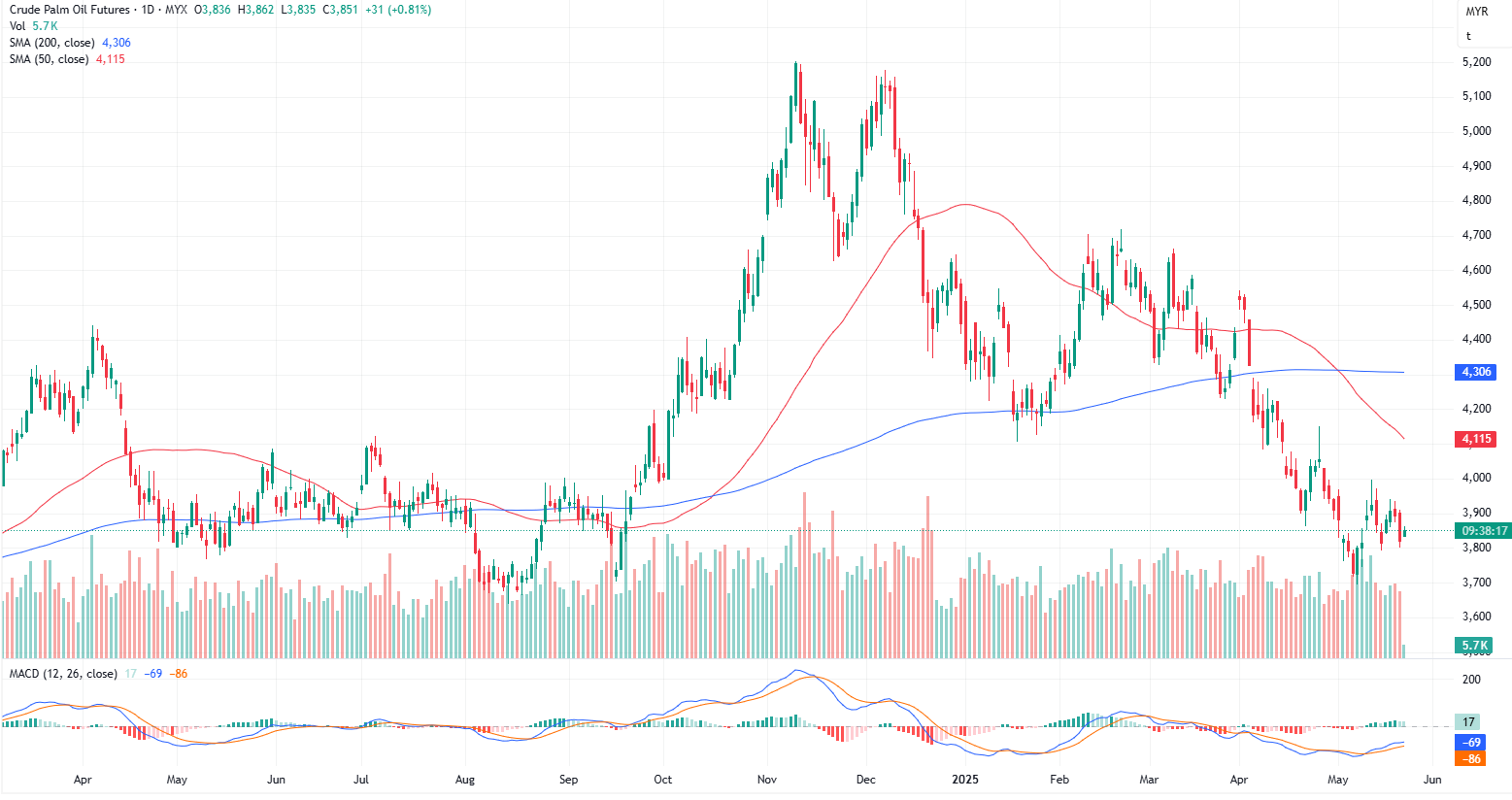 FCPO Aug month dropped 74 points or 1.90% to closed lower at 3820. Malaysian palm oil futures fell for a second straight session on Thursday, pressured by weaker soyoil prices and growing concerns about increasing production in the coming weeks.