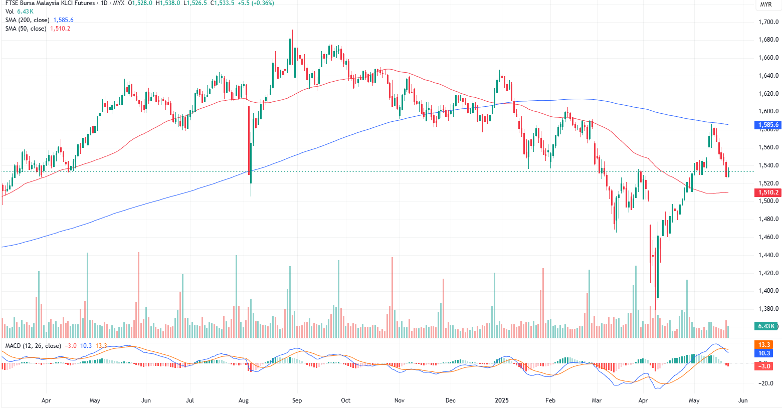 The actively traded FKLI contract continued its downward trend in the previous session. From a broader perspective, the index remains within a descending channel and has recently broken below the key support zone at 1,539–1,541, which now acts as an important resistance area. On the hourly timeframe, some technical buying interest may emerge, potentially lifting the index back toward the resistance zone at 1,539—1541, provided it can be supported firmly above the 1,533 level. Otherwise, the selling momentum is likely to persist. Beware of any potential sentiment changes. Immediate support and resistance levels are identified at 1533 and 1539, respectively.