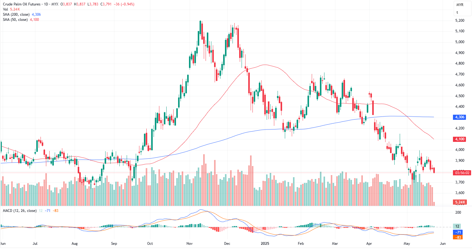 FCPO Aug month dropped 36 points or 0.94% to closed lower at 3791 on midday session. Malaysian palm oil futures slipped nearly 1% to below MYR 3,800 per tonne, marking a fourth consecutive decline, pressured by ongoing concerns over increasing supply.