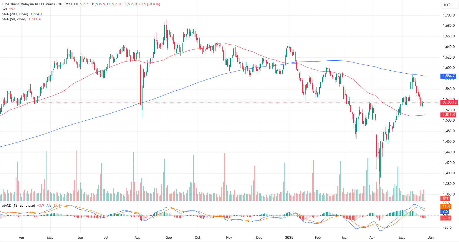 The active FKLI contract continues to trade below the support line of its downward channel, with the 1538–1540 zone now acting as resistance, maintaining a bearish bias. On the shorter timeframe, the index is consolidating within a narrow sideways range, with resistance at 1538–1540 and support at 1525–1526. A breakout in either direction could signal the next move; otherwise, sideways trading may persist. Beware of any potential sentiment changes. Immediate support and resistance levels are identified at 1533 and 1539, respectively.
