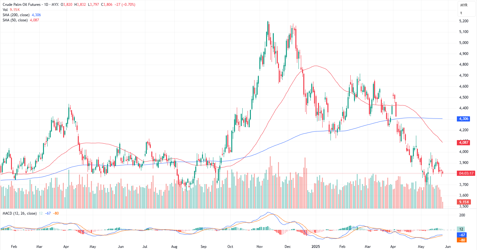 The actively traded FCPO contract remains within a broader downward channel. While the price briefly dipped below the key support zone of 3800–3805, it quickly rebounded, suggesting firm support at the lower end of the range. On the hourly chart, the market is consolidating sideways after reclaiming the 3800–3805 level. This area continues to act as a support base, potentially attracting technical buying. If prices climb higher, resistance is expected around 3860–3865. A breakout above this zone may open the door to further upside, while failure to breach it could lead to renewed selling pressure. Stay cautious of potential shifts in market sentiment. The immediate support and resistance levels are identified at 3797 and 3819, respectively.