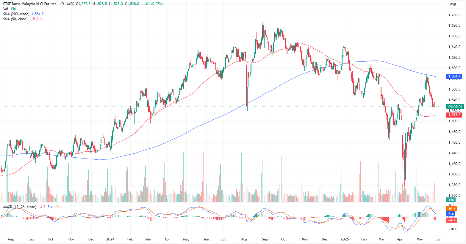 The actively traded FKLI contract continued to trend lower, breaking below the key support zone of 1531–1533, which now acts as a resistance level for any potential rebound. However, the overnight rally on Wall Street may lift market sentiment locally, potentially triggering technical buying. A breakout above the resistance could pave the way for further gains toward the 1539 level. Conversely, failure to break above may lead to renewed selling pressure, with support seen around the 1528–1526 range. Beware of any potential sentiment changes. Immediate support and resistance levels are identified at 1528 and 1533, respectively.