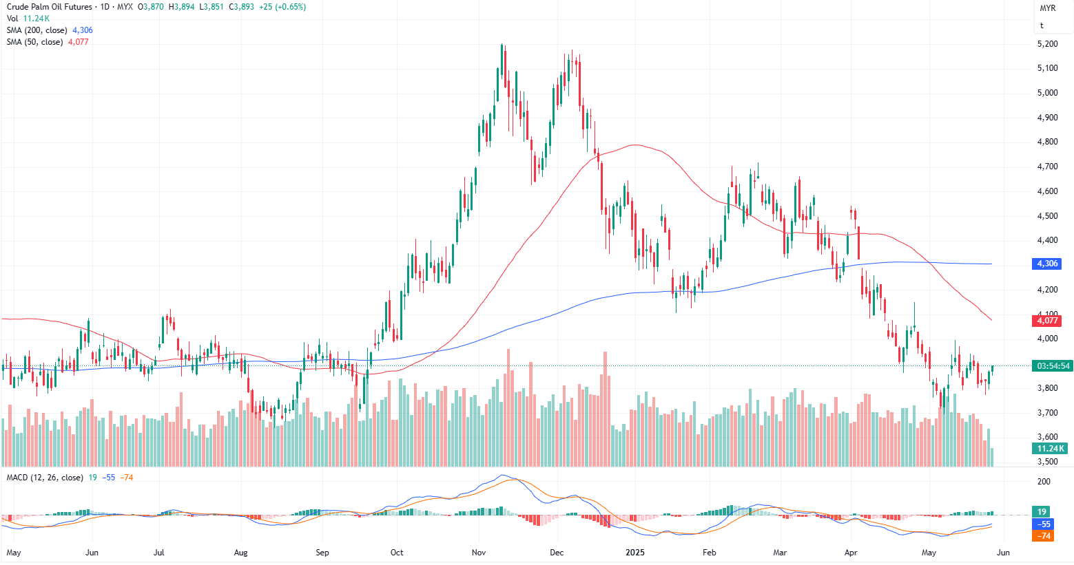 The actively traded FCPO contract recently broke above the resistance line of the broader downward channel, previously seen at the 3875–3880 range, which now acts as a new support level. We maintain a buy-on-retracement strategy for the upcoming session.