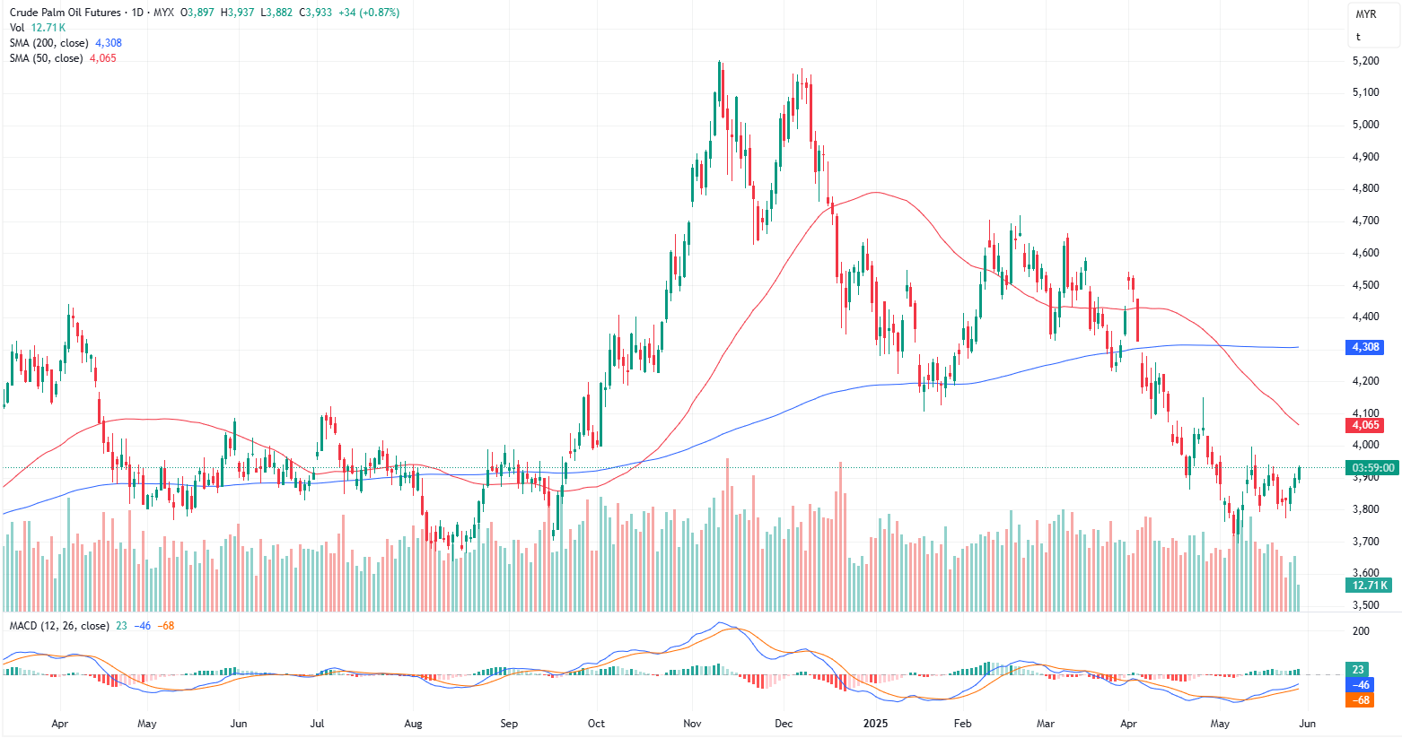 The actively traded FCPO contract opened higher with a gap up, with prices currently hovering near the upper end of the recent sideways consolidation range at 3935–3940. If this range continues to hold, there is potential for further upside toward the 3970–3975 zone. However, if the 3935–3940 support fails to hold, the market may turn lower. Immediate downside support is seen at 3890–3895, which could help sustain the current upward bias. Stay cautious of potential shifts in market sentiment. The immediate support and resistance levels are identified at 3935 and 3952, respectively.