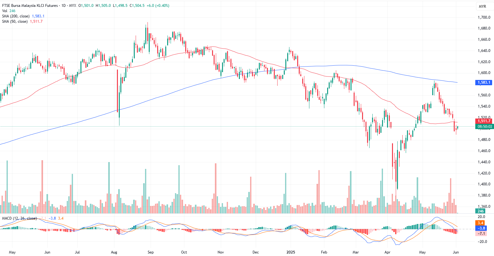 The actively traded FKLI contract remains in a downtrend after failing to stay above the 1,500–1,502 zone. The overall bias stays bearish, favoring sell-on-rebound strategies. Immediate support is seen at 1,496–1,495 — a break below this zone could trigger further selling pressure, potentially pushing the index toward 1,489 or even 1,483. If supported at these levels, some technical buying may emerge, though upside is expected to remain limited. Beware of any potential sentiment changes. Immediate support and resistance levels are identified at 1495 and 1500, respectively.
