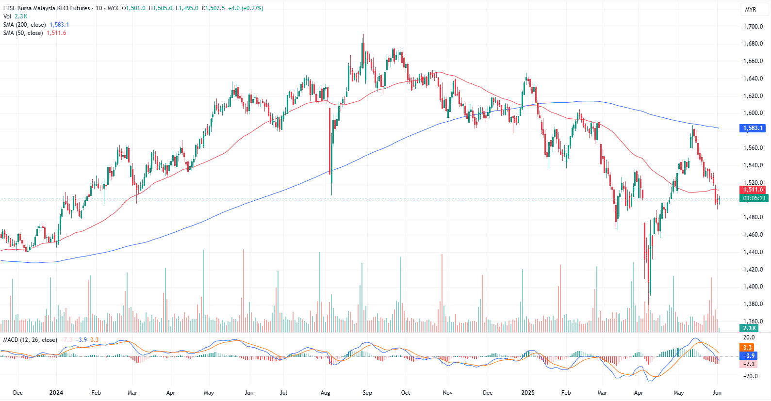 The actively traded FKLI contract remains in a downtrend after failing to hold above the 1,500–1,502 zone, keeping the bearish bias intact with a preference for sell-on-rebound strategies. The hourly chart shows a sideways consolidation, with resistance at 1,505–1,506 and support at 1,495–1,494. A breakout above resistance may lead to limited upside towards 1,510–1,511, while a break below support could trigger further downside pressure. Stay cautious of potential shifts in market sentiment. Immediate support and resistance levels are identified at 1497 and 1505 respectively.