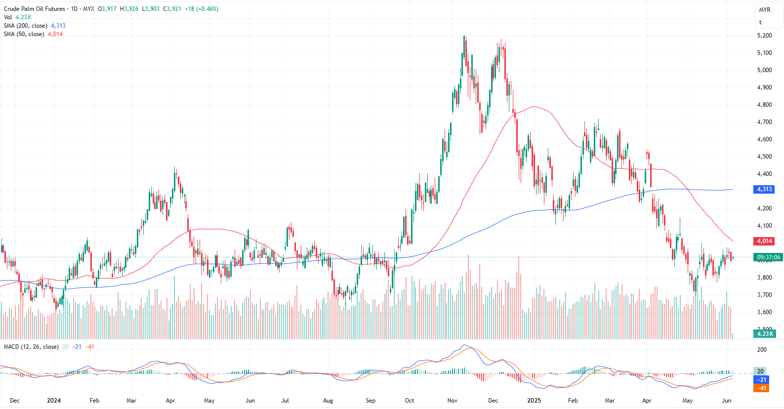 The actively traded FCPO contract remains within a broad sideways consolidation range, with support at 3,790–3,785 and resistance at 3,975–3,970. On the hourly chart, the price is currently trading in the upper part of the range, staying above the key support zone of 3,900–3,895. If this level continues to hold, the price may push higher toward 3,943 or even retest the 3,966 zone. However, a break below the support could trigger selling pressure, potentially dragging the price down to the 3,870–3,865 area. Beware of any potential sentiment changes. The immediate support and resistance levels are pinpointed at 3921 and 3943, respectively.