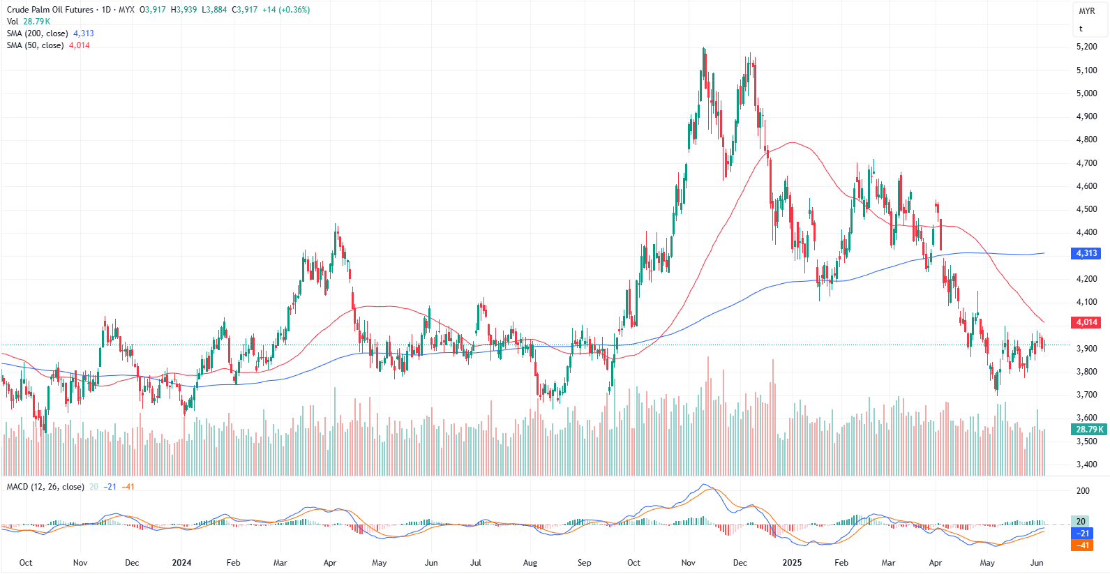 The actively traded FCPO contract continues to trade within a sideways consolidation range on the broader view. Key support levels are seen at 3,790–3,785, while resistance lies between 3,975–3,970. On the daily chart, prices are hovering near the upper boundary of this range. Immediate support is observed at the 3,885–3,880 area. Since the end of May, the price has repeatedly attempted to break above the range top but failed, forming lower highs and showing signs of a downside bias.