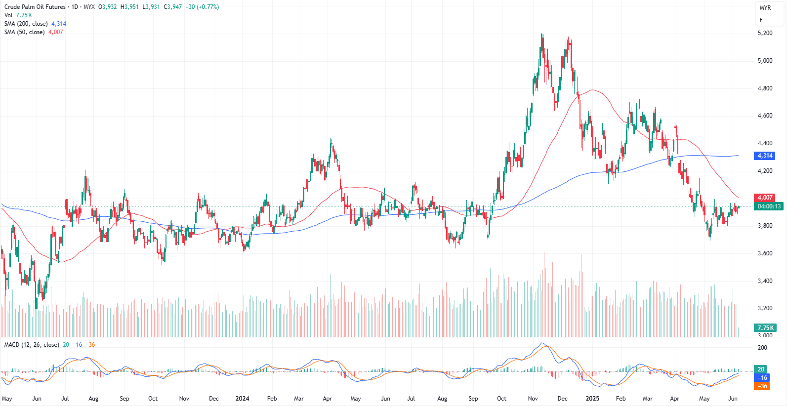 The actively traded FCPO contract continues to trade within a sideways consolidation range on the broader view, with key support levels at 3,790–3,785 and resistance between 3,975–3,970. On the daily chart, prices are currently hovering near the upper boundary of this range. A new immediate support zone has emerged at 3,940–3,935. As long as prices remain supported above this range, there is potential for a buying opportunity, with upside targets seen at 3,965–3,970 and possibly extending to 3,990. However, a failure to hold above the 3,940–3,935 support zone could trigger renewed selling pressure. Stay cautious of potential shifts in market sentiment. The immediate support and resistance levels are identified at 3943 and 3966, respectively.
