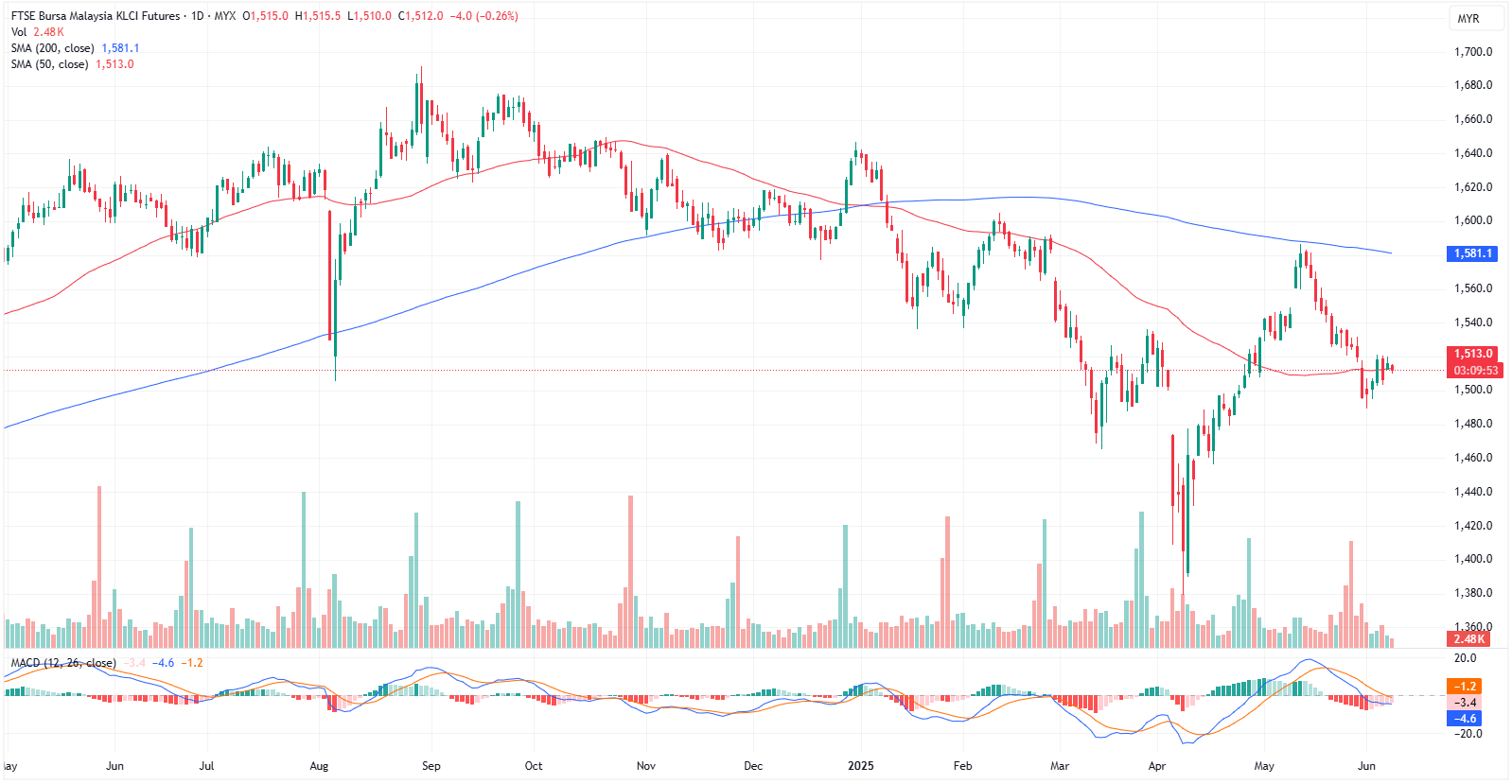 The actively traded FKLI contract continues to trade near the midpoint of a broad downward channel on the daily chart. After facing persistent selling pressure from May 15 to June 3, the index found support around the 1,498–1,497 zone, indicating potential for a technical rebound. However, the hourly chart shows prices moving within a narrow sideways range. Immediate support is seen at the 1,510–1,511 level. Holding above this zone may present a short-term buying opportunity, with an upside target around 1,518–1,520. Conversely, a break below the support could lead to further selling pressure toward the 1,504–1,505 area. Stay cautious of potential shifts in market sentiment. Immediate support and resistance levels are identified at 1513 and 1518 respectively.