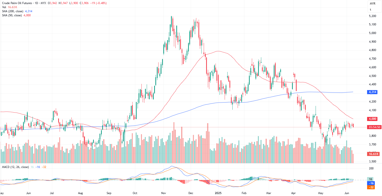 The actively traded FCPO contract continues to trade within a sideways consolidation range on the broader view, with key support at 3,790–3,785 and resistance between 3,975–3,970. On the daily chart, prices are hovering near the upper boundary of this range, maintaining a neutral stance as the sideways trend remains intact. Immediate support is noted at the 3,885–3,890 zone, while fresh resistance has emerged at 3,915–3,920. A breakout above this level could potentially push prices higher toward 3,940 or beyond. However, failure to break above this resistance may invite renewed selling pressure. Stay cautious of potential shifts in market sentiment. The immediate support and resistance levels are identified at 3888 and 3917, respectively.