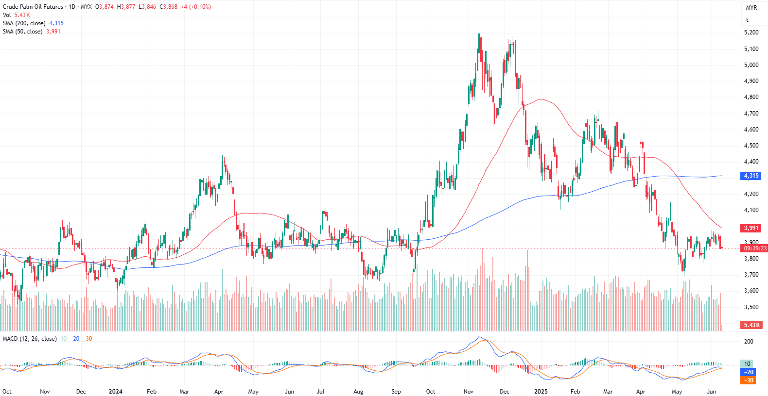 The actively traded FCPO contract remains within a broader sideways consolidation range, with key support at 3,790–3,785 and resistance between 3,975–3,970. On the hourly chart, the price is moving within a short-term downward channel but appears to be supported near the upper boundary of the broader sideways range. Immediate support is seen at the 3,860–3,865 zone, which may help prevent further downside. There is potential for technical buying, though any upside may be limited, with immediate resistance around 3,885–3,890.