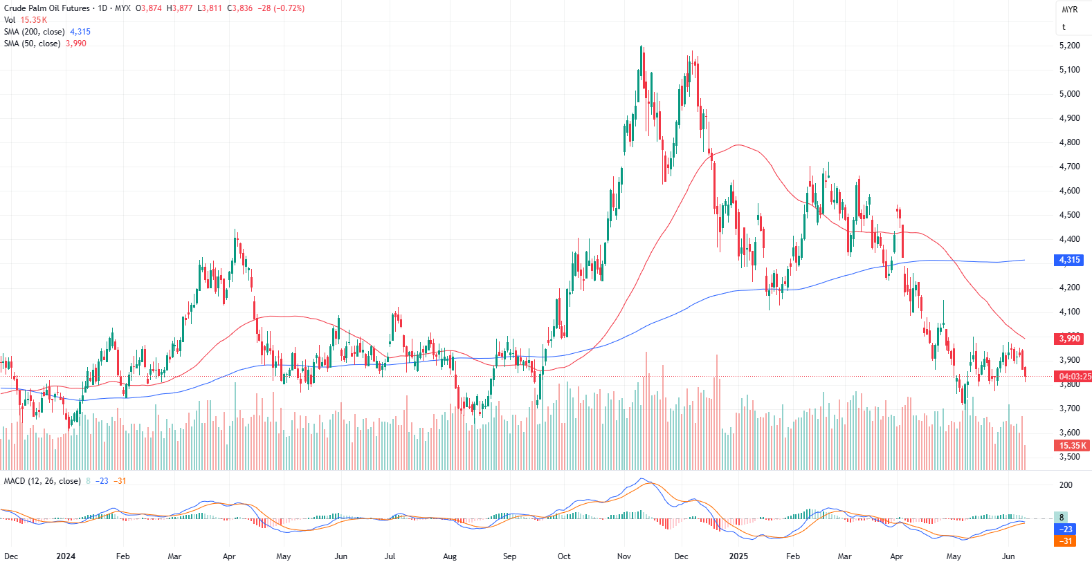 The actively traded FCPO contract remains within a broader sideways consolidation range, with key support at 3,790–3,785 and resistance between 3,975–3,970.