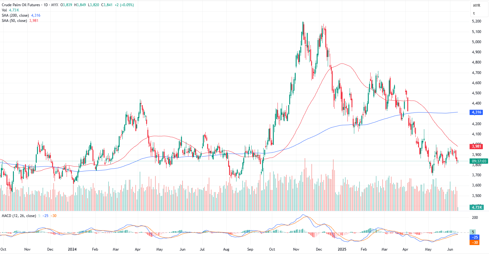 The actively traded FCPO contract continues to trade within a broader sideways consolidation range, with key support at 3,790–3,785 and resistance between 3,975–3,970. In the previous session, prices failed to hold above the 3,860–3,865 support zone and are now lingering near the lower boundary of the range. We maintain a sell-on-rebound strategy, with immediate resistance seen at the 3,840–3,845 zone. A breakout above this level may trigger short-term technical buying toward 3,865, or potentially as high as 3,888. However, failure to breach this resistance could lead to renewed selling pressure from that point. Beware of any potential sentiment changes. The immediate support and resistance levels are pinpointed at 3820 and 3798, respectively.