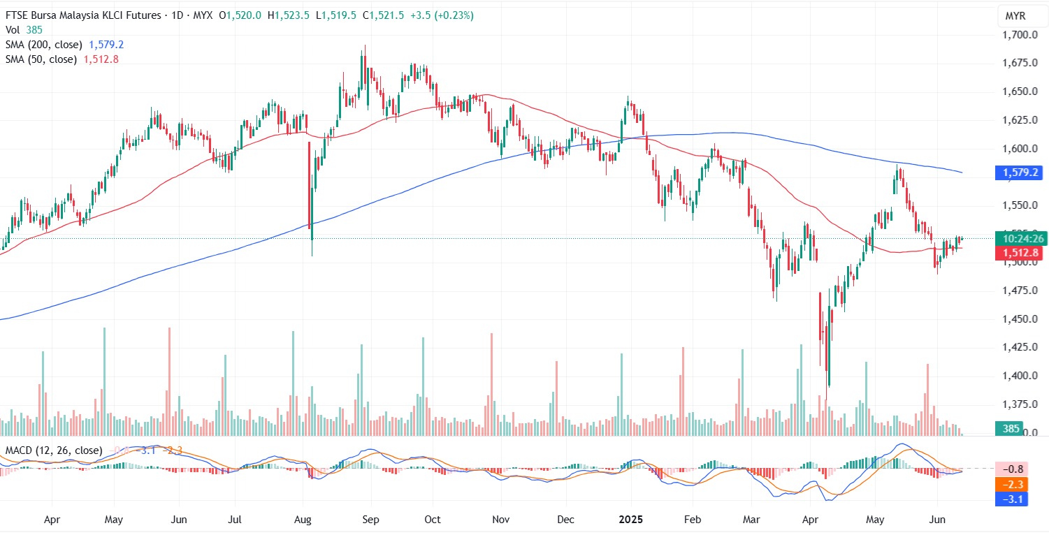 FKLI June month dropped 4 points or 0.26% to close lower at 1518. The FBM KLCI ended higher for the second consecutive day, supported by selective  buying  in  heavyweight  stocks  amid  a  cautious  trading environment. Market sentiment remained guarded due to persistent uncertainties surrounding global trade developments and a mixed performance across major regional markets.