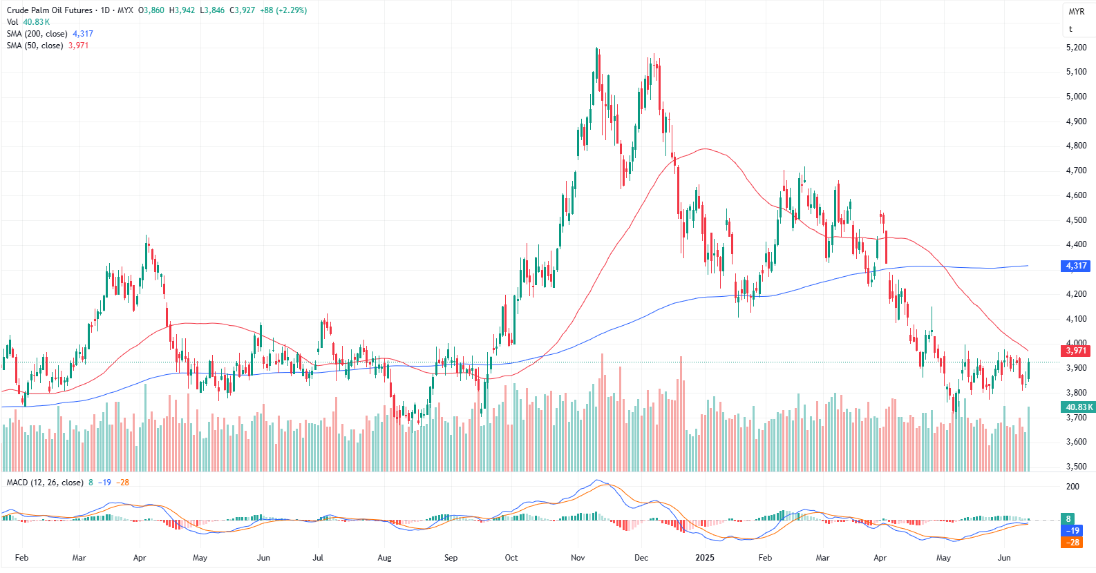 The actively traded FCPO contract has rolled forward to the September 2025 contract starting today. The contract remains within a broad sideways consolidation range, with key support at 3,790–3,785 and resistance at 3,975–3,970. On the shorter time frame, the price is now trading near the upper boundary of this range. Given the strong positive momentum in rival markets, palm oil prices are likely to open with a gap up. Immediate resistance is seen at 3,970–3,980; a breakout above this level may lead to further upside toward the 4,000 mark. However, failure to break above the resistance could trigger some selling pressure, with limited downside likely toward the 3,955–3,960 support zone. Beware of any potential sentiment changes. The immediate support and resistance levels are pinpointed at 3927 and 3958, respectively.