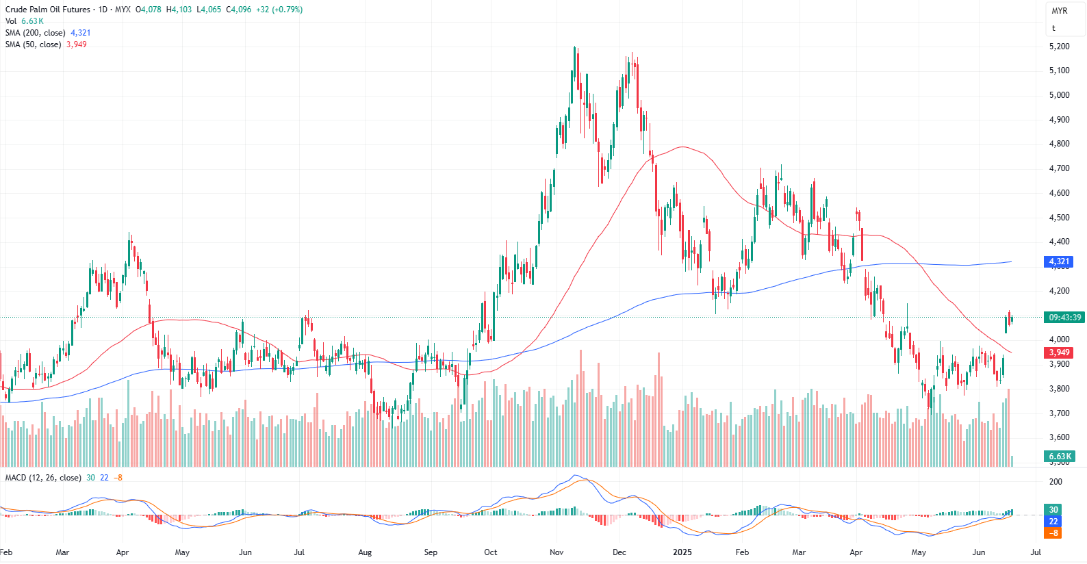 FCPO Sep month dropped 30 points 0.73% to closed lower at 4064. Malaysian palm oil futures ended lower on Tuesday, breaking a three-day winning streak, pressured by weakness in Chicago soyoil and profit-taking activities.