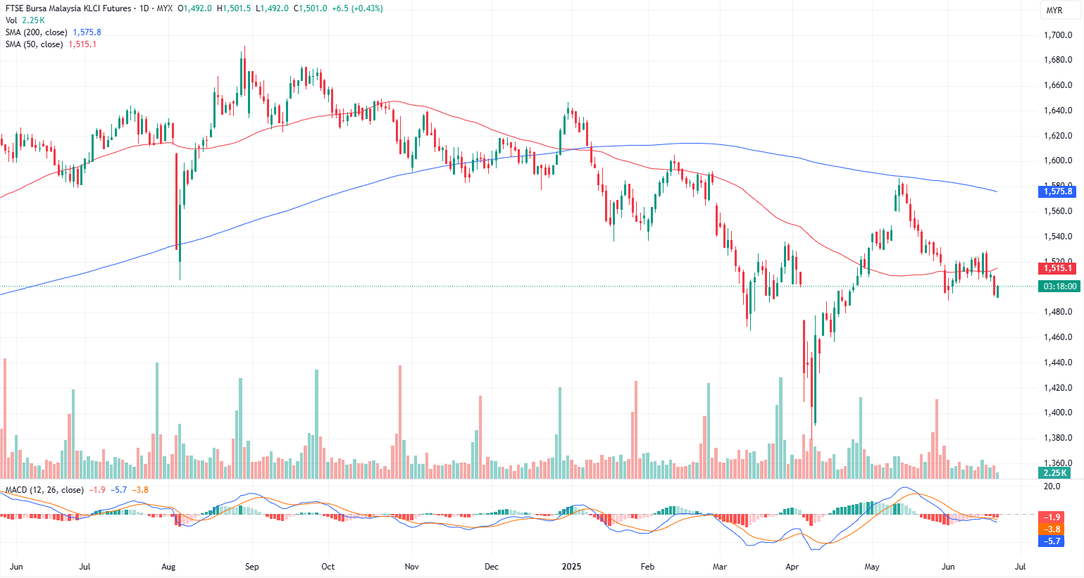 The actively traded FKLI contract remains in a bearish momentum, although it continues to trade within the midrange of a broad downward channel. We maintain a sell-on-rebound strategy as the primary approach. That said, some technical buying may emerge, potentially lifting the index toward the 1,504–1,505 resistance zone, where selling pressure is expected to resume. Stay cautious of potential shifts in market sentiment. Immediate support and resistance levels are identified at 1498 and 154 respectively.