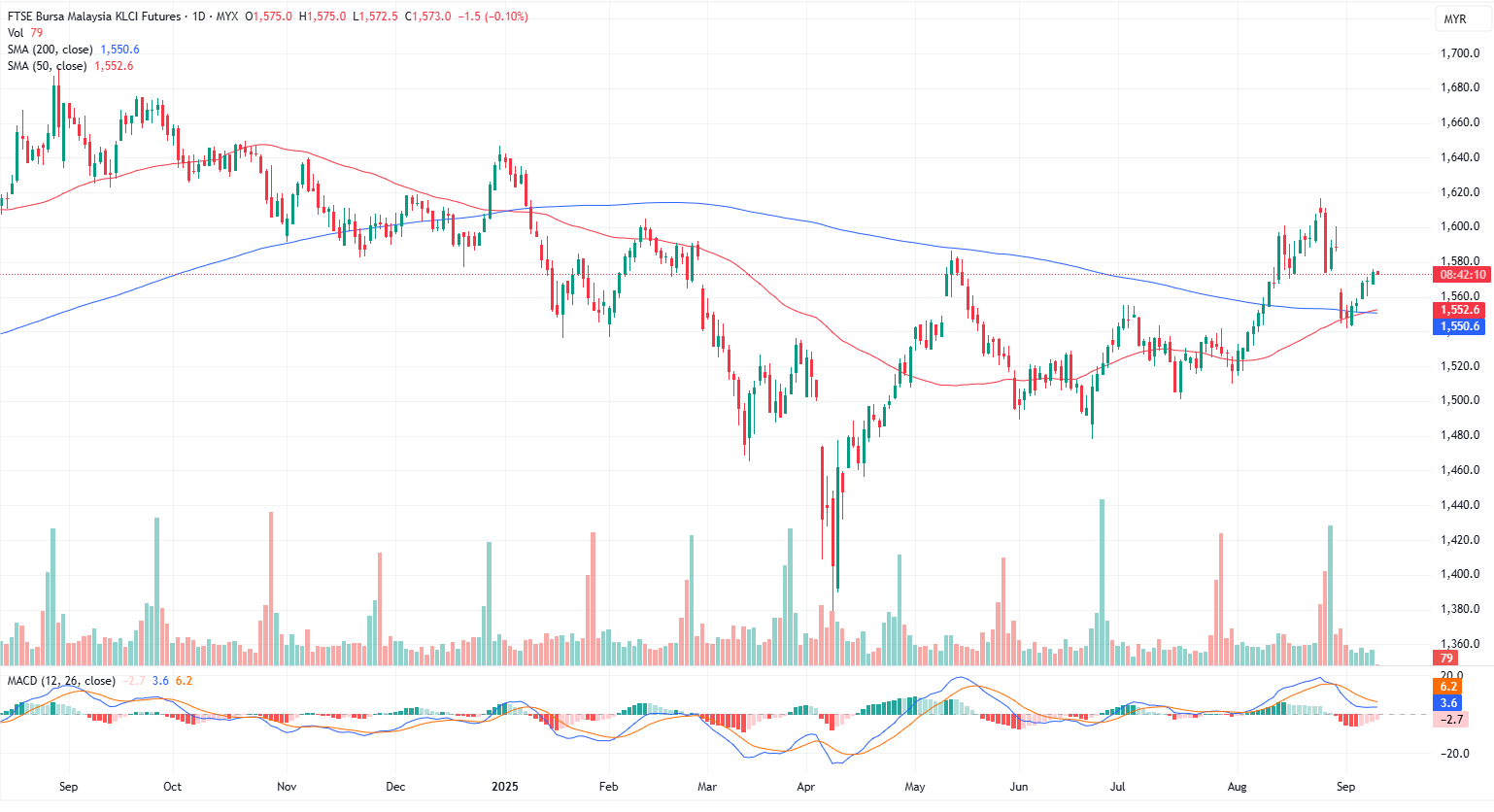 FKLI Sep month rose 5 points or 0.32% closed higher at 1574.5 on previous trading session. Bursa Malaysia ended trading on a positive note yesterday, marking its third consecutive day of gains in line with other major Asian bourses.