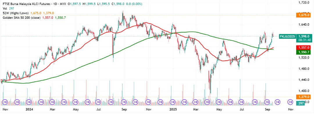 FKLI Sep month lose 8.5 points or 0.53% closed at 1598.5. Technical play has pressure the FBM KLCI down along with cautious trading sentiment.