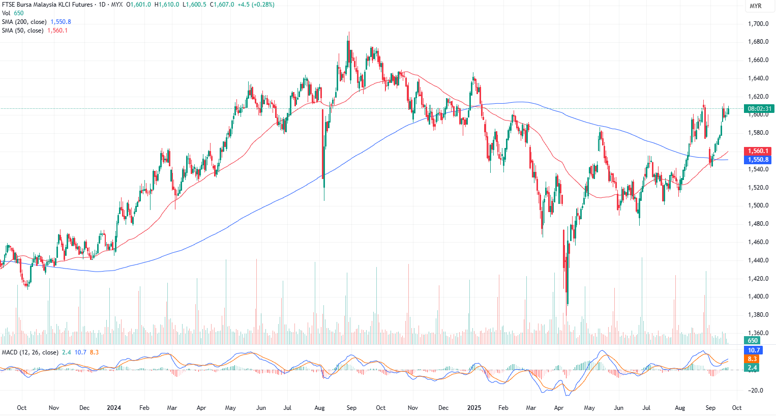 The actively traded FKLI contract continued its upward movement after closing higher in the previous session. However, the index is still facing resistance near the 1616–1620 range, forming a potential double top. A breakout above this range could drive the index higher, while failure to break through may trigger selling from this area, though with limited downside. On the smaller time frame, a minor upward channel is forming, with support seen at the 1603–1605 range, which needs to hold to sustain the upside momentum. Beware of any potential sentiment changes. Immediate support and resistance levels are identified at 1603 and 1607, respectively.