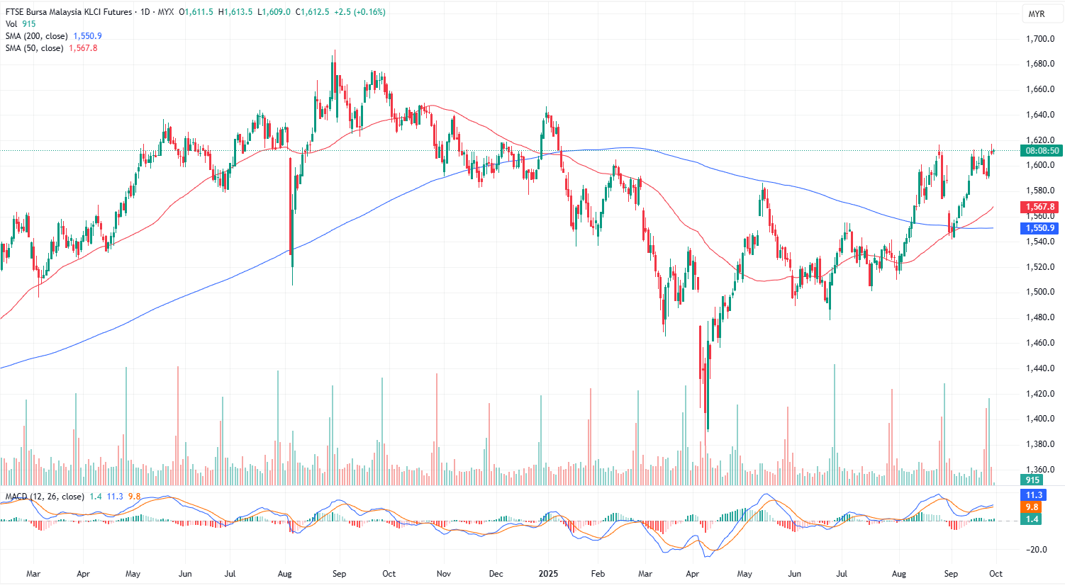 FKLI Sep month rose 2 points or 0.12% closed at 1610. The FBM KLCI closed near flat on previous session amid cautious sentiment in regional market.
