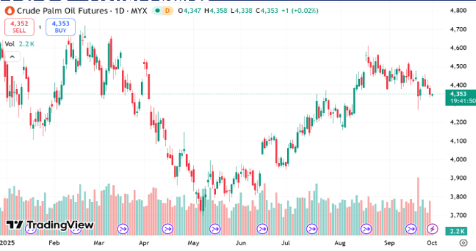 FCPO Dec month down 34 points or 0.27% to closed at 4352. Malaysian palm oil futures slide amid weak rival oils and technical retracement.