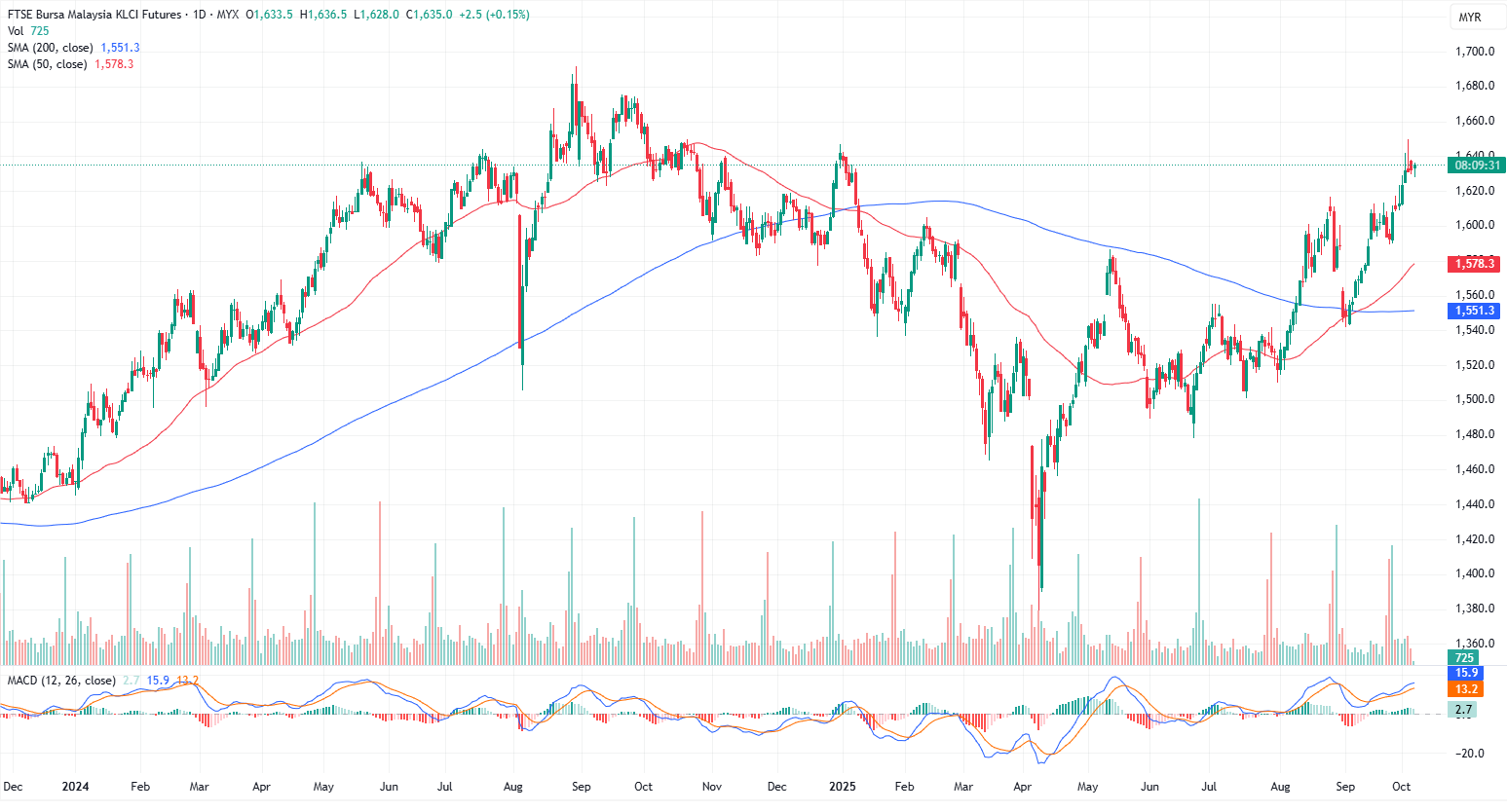 FKLI Sep month rose 1 point or 0.06% closed at 1632.5. Late buying lifted the FBM KLCI to finish at its intraday high, even as broader market sentiment remained weak.