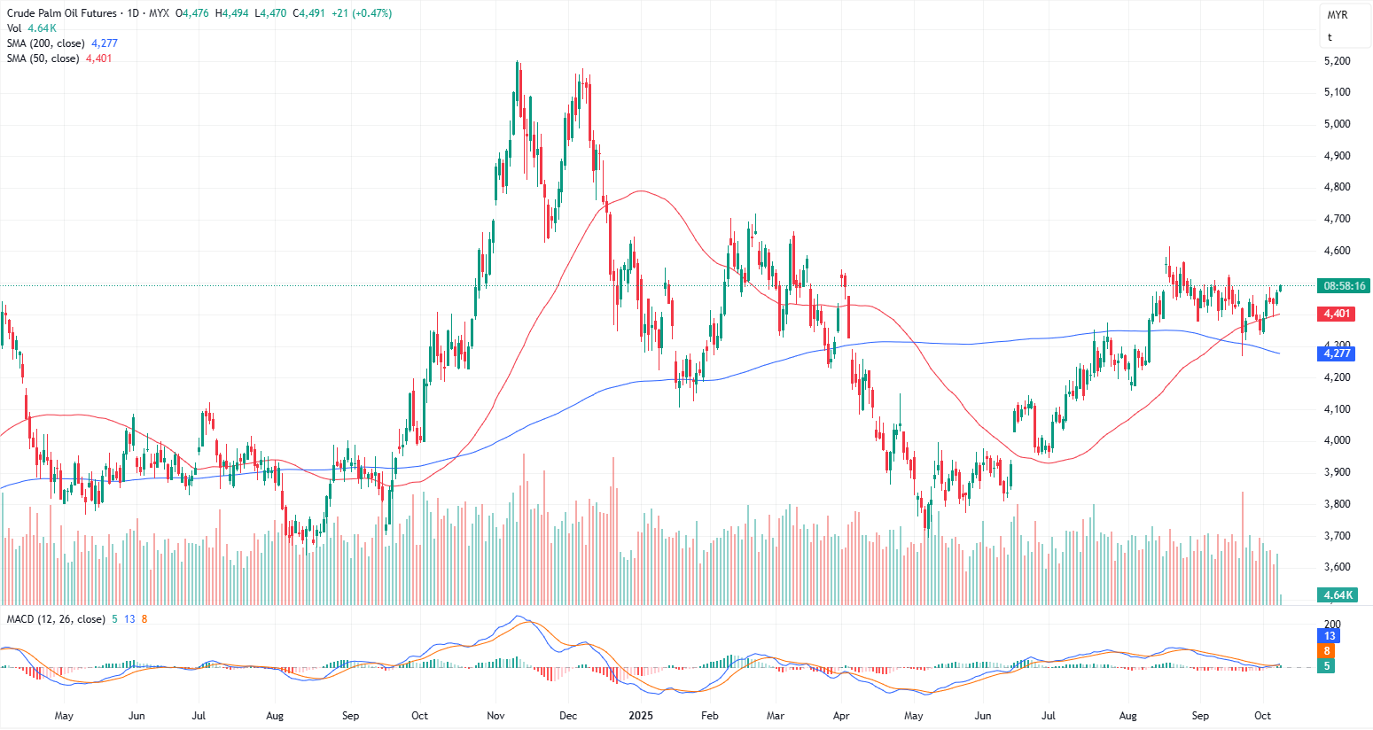 The actively traded FCPO contract closed higher in the previous session, breaking above the resistance line of the broader downward channel, with the 4,470–4,475 range now serving as immediate support to prevent a shift toward a downside bias. We anticipate the market to maintain its positive momentum, with a buy-on-retracement strategy favored. The next potential targets are seen at 4,500 and 4,525. Beware of any potential sentiment changes. Immediate support and resistance levels are identified at 4478 and 4500, respectively.