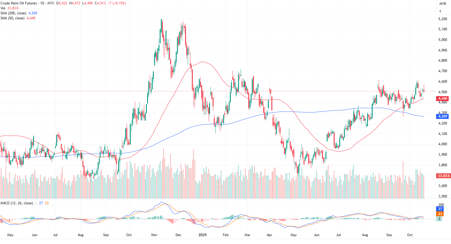 The actively traded FCPO contract on the daily chart continues to hover within a broad sideways range, with the midpoint seen around the 4480–4485 zone, supporting prices to remain on the upper side of the range. On the hourly chart, prices are moving within an upward channel, forming a series of higher lows, and are currently supported above the 4500 level. Immediate resistance is spotted at 4520–4525; a breakout above this range could drive prices higher toward 4548 or even 4572. However, failure to break above 4520–4525 may trigger a pullback toward 4500, the key level to maintain the minor upward channel. Beware of any potential sentiment changes. Immediate support and resistance levels are identified at 4501 and 4525, respectively.
