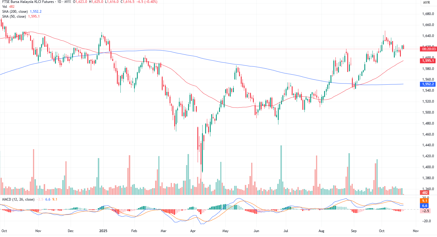 The actively traded FKLI contract on the daily chart continues to move within an uptrend pattern, though current momentum shows a downside bias, suggesting the index is undergoing a technical correction. On the hourly chart, we remain to see the prices are facing resistance near the 1620–1618 range — a breakout above this level could drive the index higher. Otherwise, sentiment is expected to remain sideways to mildly bearish. Immediate support is seen at 1613–1612; a break below this range may lead to further weakness toward 1609–1607. Beware of any potential sentiment changes. Immediate support and resistance levels are identified at 1618 and 1623, respectively.