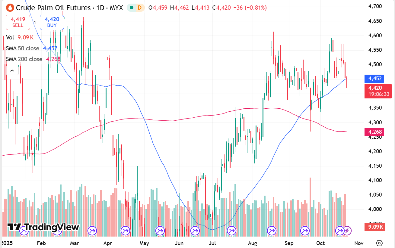 FCPO Dec month down 51 points or 1.13% to closed at 4454. Malaysian palm oil futures unable to sustain price as MPOA production for the first 20 days of October increased by 10.77%.