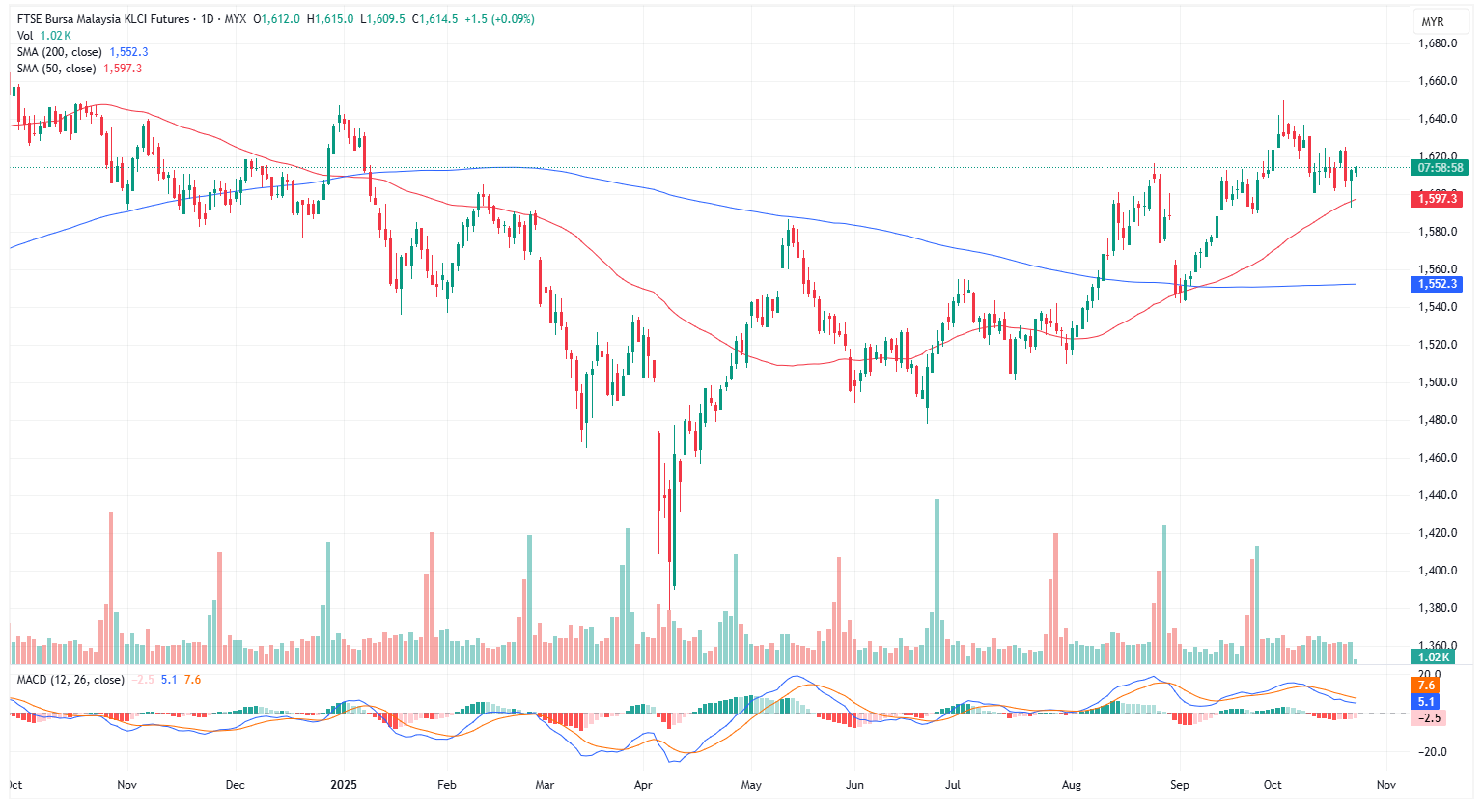 The actively traded FKLI contract on the daily chart continues to move within an uptrend pattern, although recent price action shows a sideways range, with crucial support spotted at 1600–1595 and resistance near 1620–1625. On the smaller time frame, buying momentum appears to remain intact, and a retracement toward 1607–1606 could present buying opportunities. However, the upside may be limited, with the initial target at 1615–1616. A break above this level could see the index extend higher toward 1621–1622.Beware of any potential sentiment changes. Immediate support and resistance levels are identified at 1607 and 1612, respectively.