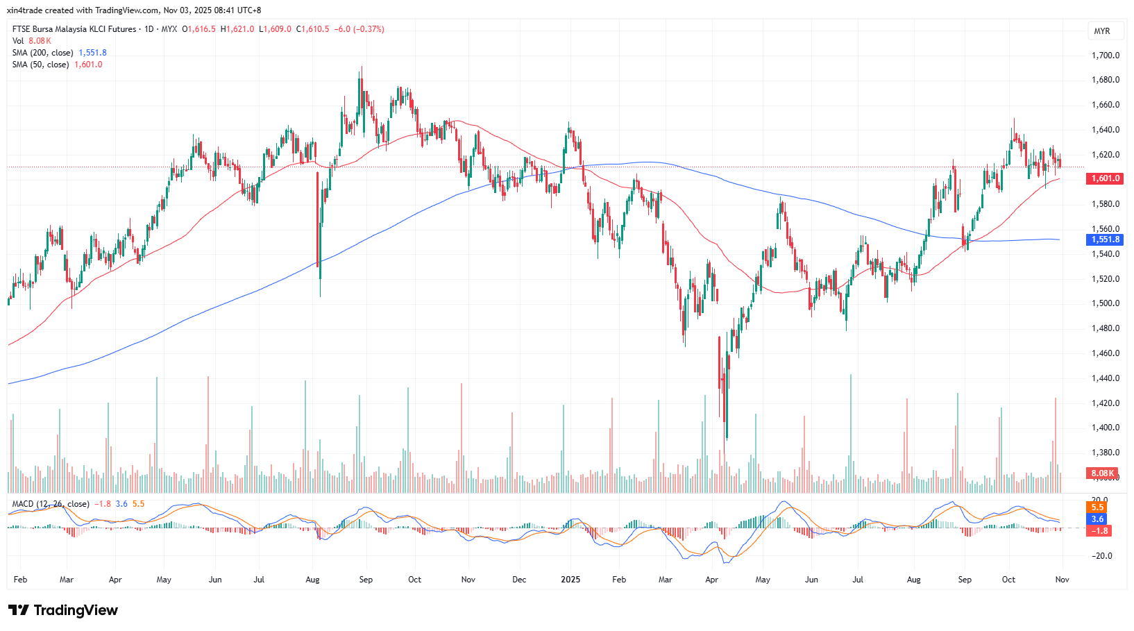 The actively traded FKLI contract (month) continues to move within an upward channel on the daily chart, indicating that the long-term trend remains positive. However, on the hourly chart, the index has been trading within a sideways range since early October 2026, with resistance seen at 1624–1626 and support at 1600–1605. A breakout in either direction could trigger the next major move. For now, we may see buying interest emerging near the 1616–1617 support zone. Holding above this range could lead to an upside movement toward 1622, while a failure to hold may signal a downside move toward 1613. Beware of any potential sentiment changes. Immediate support and resistance levels are identified at 1613 and 1618, respectively.