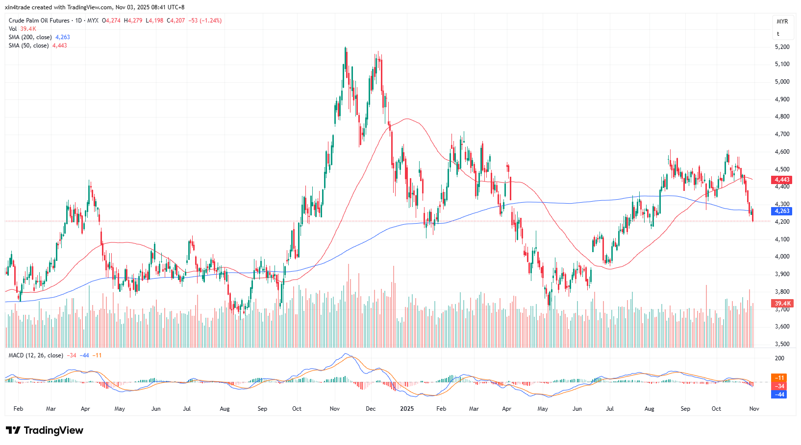 The actively traded FCPO contract traded further lower toward the 4200 range after breaking below the previous support at 4235–4230, which has now turned into a resistance area — a potential selling zone if prices rebound back to this range amid the current bearish sentiment. On the shorter time frame, the market shows consolidation within a sideways range of 4280 (top) to 4230 (bottom) before breaking lower. We maintain a sell-on-rebound strategy for the next move, with the next target at 4177, and the lowest level potentially at 4160. Only a rebound above 4230 would suggest a pause in further selling pressure. Immediate support and resistant levels are identified at 4202 and 4228 respectively. Beware of any potential sentiment changes.