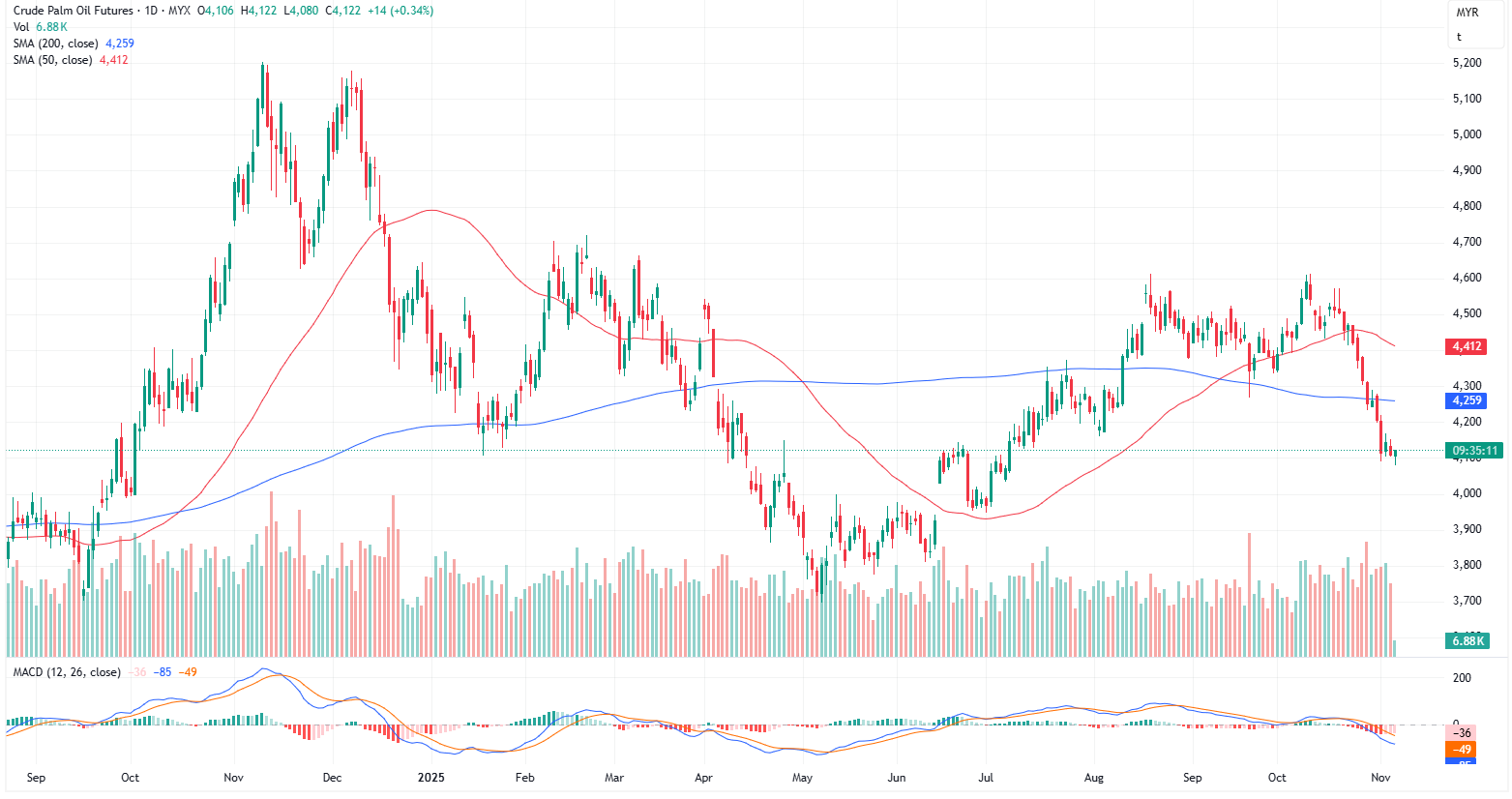 The actively traded FCPO contract closed slightly higher, supported by technical buying. However, overall sentiment remains bearish as the daily chart continues to trade below the immediate resistance zone at 4150–4160. In the shorter time frame, technical buying momentum may persist if the price successfully breaks above the 4150–4160 resistance range, potentially extending toward 4175. On the other hand, if the resistance zone remains firm, renewed selling pressure could emerge from the range, leading prices to continue consolidating within a narrow band of 4150–4160, with a lower support level seen near 4100. Immediate support and resistant levels are identified at 4106 and 4130 respectively. Beware of any potential sentiment changes.