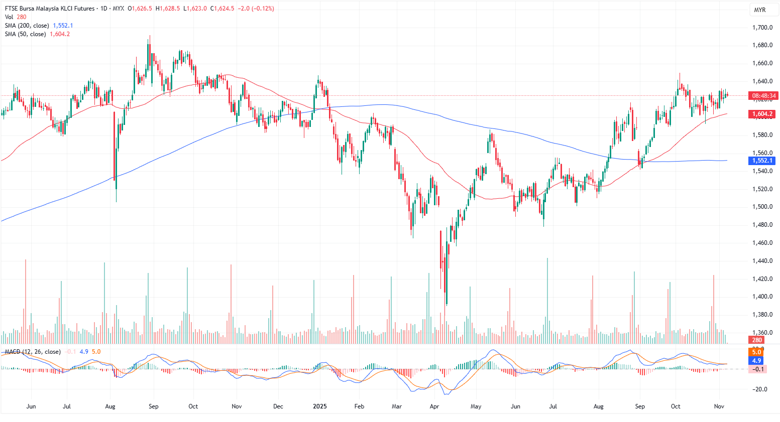 The actively traded FKLI contract continues to move within an upward channel on the daily chart, indicating that the long-term trend remains positive. However, on the hourly chart, the index has been trading within a sideways range since early October 2026, with crucial resistance remain seen at 1626–1628 and bottom remain spot at 1600–1605. A breakout in either direction could trigger the next major move. For the short term, holding above the 1,618–1,616 range could maintain a buying bias. However, failure to hold this support zone may lead the index to further downside movement toward the 1,610 level. In Beware of any potential sentiment changes. Immediate support and resistance levels are identified at 1618 and 1623, respectively.