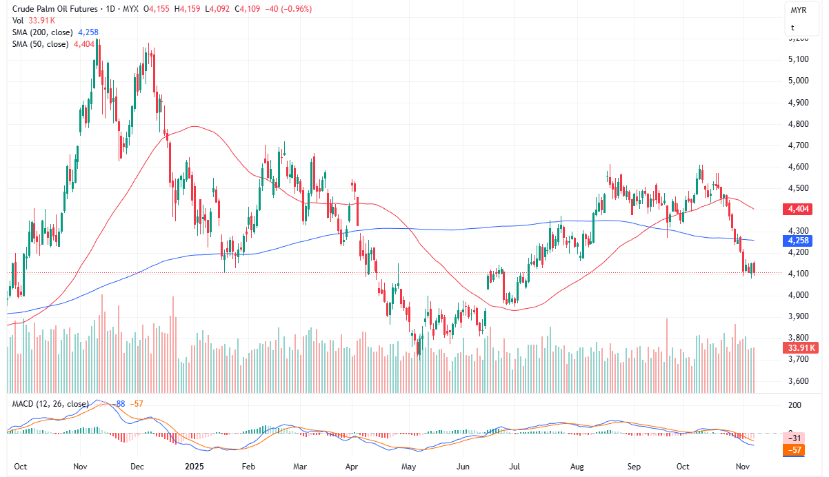 FCPO Jan month down 39 points or 0.94% to closed at 4110. Malaysian palm oil futures remained uncertain closing near day low on last Friday as traders are anticipating for the MPOB data releasing on the 10th Nov 2025, today.