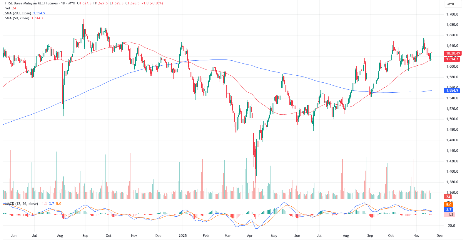 The actively traded FKLI contract turned positive in the previous session. On the daily chart, the index continues to hold above the uptrend support at the 1611–1612 range, leading to renewed buying interest. On the shorter time frame, new support is seen at 1626–1627 to sustain the upward movement. We may see further buying as long as this level holds. Immediate resistance is located at 1631–1633; a breakout above this zone could lift the index toward 1636–1637. If the price fails to break this resistance, the index may move sideways with limited downside.  Immediate support and resistance levels are identified at 1626 and 1631, respectively. Beware of any potential sentiment changes.