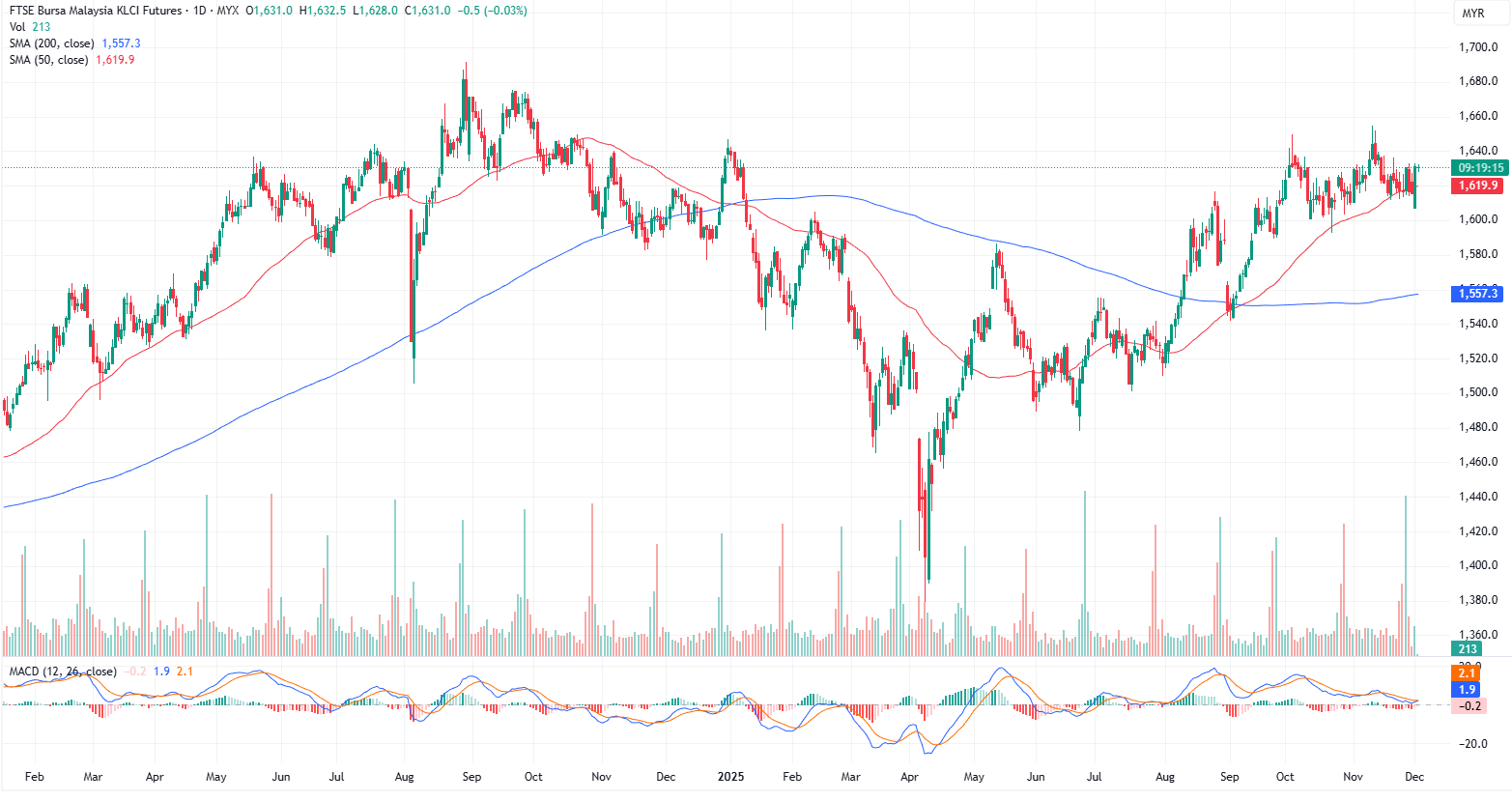 The FKLI active contract closed with strong gains in the previous session. However, the broader trend still appears to be moving within a sideways range, with the lower boundary at 1600–1605 and the upper boundary near 1645–1650. The strong upward movement seen in the last session may continue to support buying momentum in the short term, especially if the immediate resistance at 1636–1640 is broken. A breakout above this level may open the path toward the upper range.