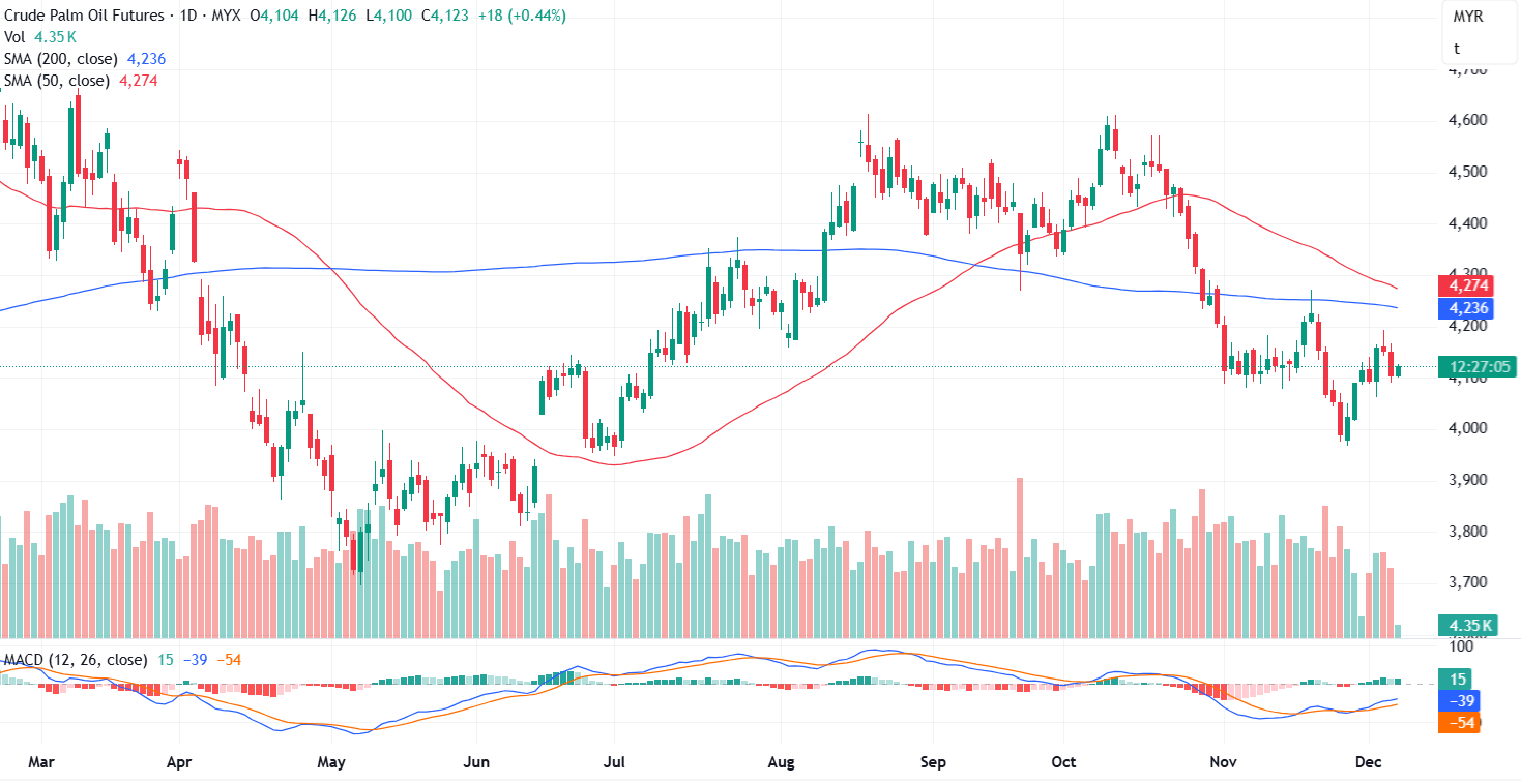 The actively traded FCPO contract closed lower for the second consecutive session, reaching a low of 4091, indicating the potential for continued downside bias. The 4120–4125 zone now acts as the immediate resistance, while support is seen at 4100–4080. If the price breaks below the previous low, we may see further downside movement toward 4075, or possibly 4051. However, if the price holds above the recent low, a period of sideways consolidation may develop, with the upper boundary potentially extending toward the 4150 range. Immediate support and resistant levels are identified at 4098 and 4121 respectively. Beware of any potential sentiment changes.