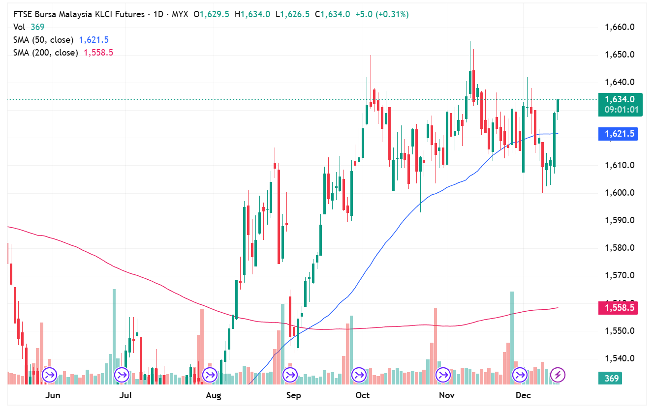 FKLI Dec month rose 17.5 point or 1.09% to close at 1629.5. The FBM KLCI surged as regional markets gained buying momentum after the Feds had announced an interest rate cut.