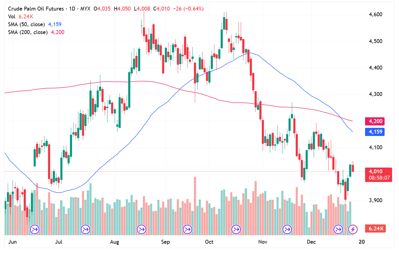 FCPO Dec month down 26 points or 0.64 % to closed at 4010. Malaysian palm oil futures sentiment is mixed to slightly friendly amid firm rival oils.
