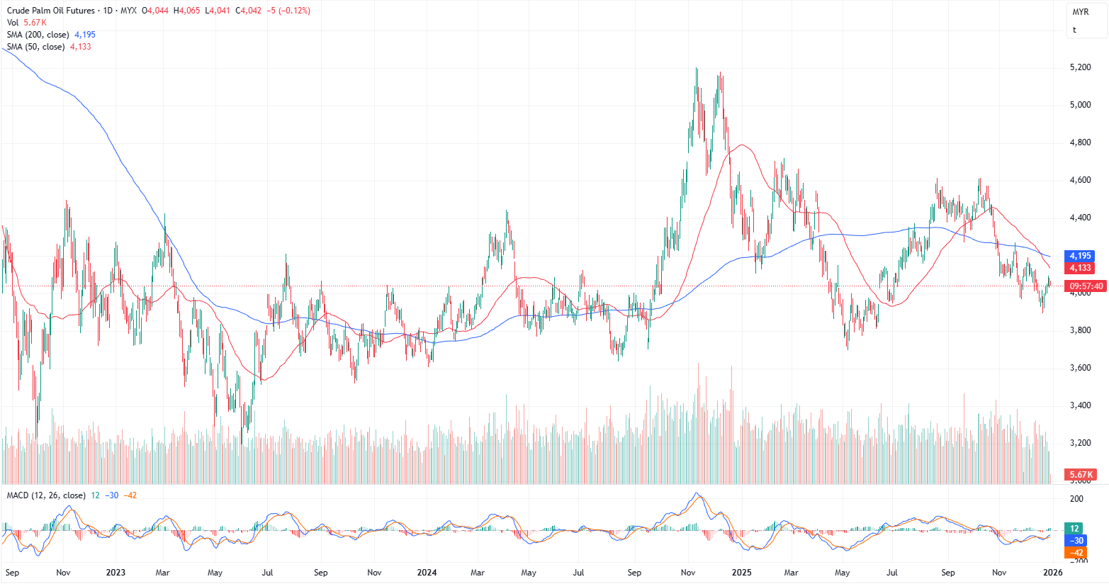 The actively traded FCPO contract continues to trade within a downward channel on the daily chart. Prices tested the resistance line at the 4,090–4,095 range and subsequently faced selling pressure. The downside bias is likely to persist, with selling on rebounds remaining the preferred strategy. Immediate resistance is seen at the 4,055–4,060 range, which may act as a selling zone if prices fail to hold above this level. Downside targets are located at 4,037, with a further extension potentially toward the 4,018 range. Immediate support and resistant levels are identified at 4037 and 4058 respectively. Beware of any potential sentiment changes.