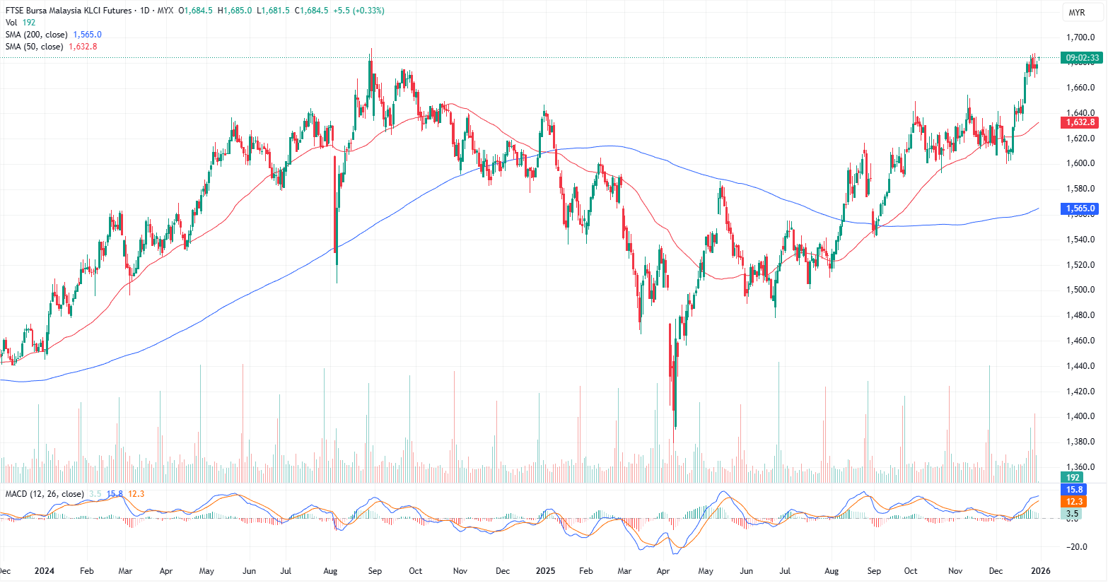 The active FKLI contract has rolled over to the January contract starting today. The FKLI index continues to hold within an upward trend, with a key resistance zone at 1,686–1,688, where the index is currently trading below.