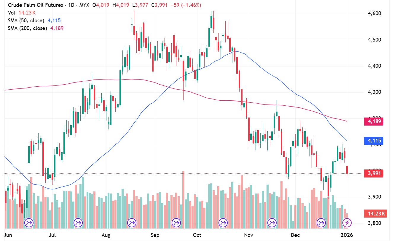 FCPO Dec month down 60 points or 1.48% to closed at 3990. Malaysian palm oil futures turned negative as weak rival oils weigh market in earlier sessions.