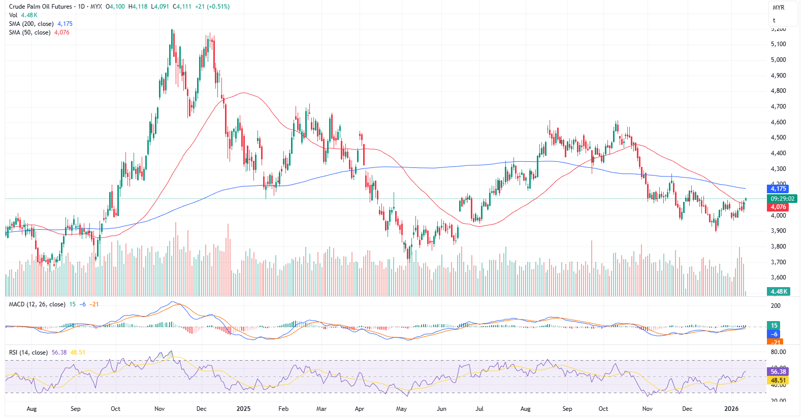 The active FCPO contract trended higher in the previous session, with prices holding above the former resistance zone of 4,090–4,100, which has now turned into a key support level following the recent strong buying. Supported by positive sentiment in the rival oil market, the contract is expected to open higher in today’s session. Immediate resistance is seen at the 4,150–4,160 range, and a buy-on-retracement strategy remains preferred, with the next major resistance located at 4,190–4,200. Immediate support and resistant levels are identified at 4095 and 4120 respectively. Beware of any potential sentiment changes.