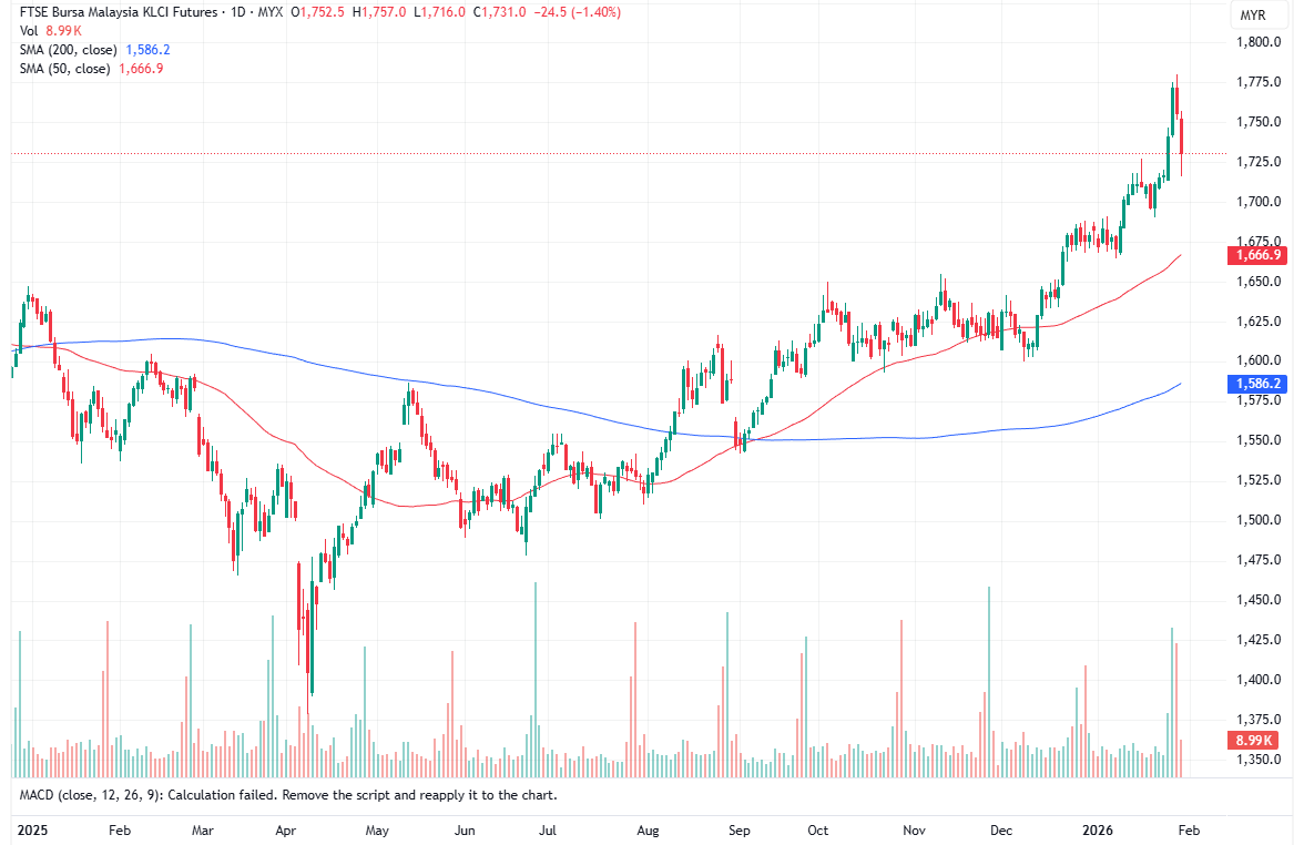 The active FKLI contract switches to the February month from today onward. The index declined for two consecutive sessions but found support at 1,716 and has since rebounded, suggesting the short-term technical correction may be complete. As long as prices hold above the 1,735–1,738 range, the index is likely to remain supported. Immediate resistance is seen at 1,748–1,750; a break above this zone could open the way for further upside. Failure to break higher may result in sideways consolidation between 1,735–1,738 and 1,748–1,750. Immediate support and resistance levels are identified at 1738 and 1744, respectively.