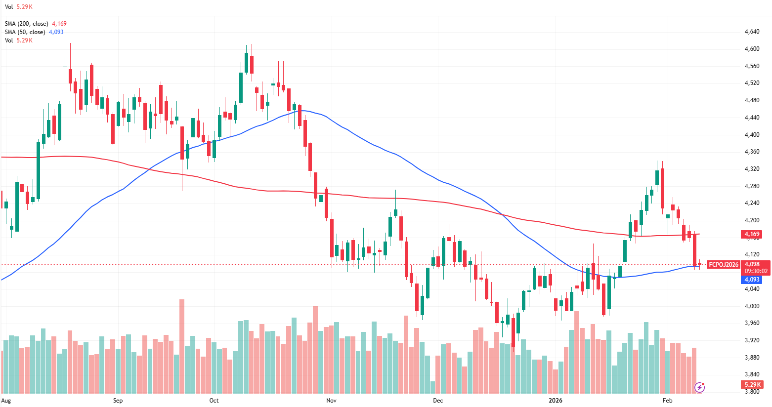 The active FCPO contract closed with a bearish candle, breaking below the SMA-200 but finding support at the SMA-50. Failure to hold this support may lead to further downside. On the 5-minute chart, price maintains a weak sentiment and continues to decline, though immediate support is seen at the 4088–4085 level, where a small double bottom has formed.