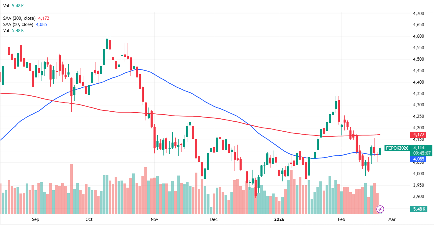 The active FCPO contract is finding support at the SMA-50, with a green candle forming after a Doji candlesticks, signalling a potential bullish continuation. On the 5-minute chart, prices are establishing higher lows, climbing from 4005 to 4055, which reflects building upward momentum. To confirm further upside strength, the price needs to break above the 4150 level.